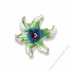 S 1151 Очарователна златна брошка "Зелено-синя орхидея" с черна перла