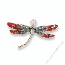 S 1150 Стилна златна брошка "Водно конче" в червено и сиво с розова перла