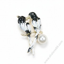S 1148 Екзотична златна брошка "Черно-бели папагали" с красива перла