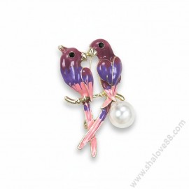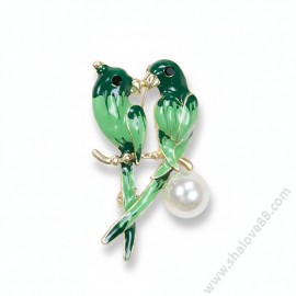 S 1148 Елегантна златна брошка "Зелени папагали" с красива бяла перла